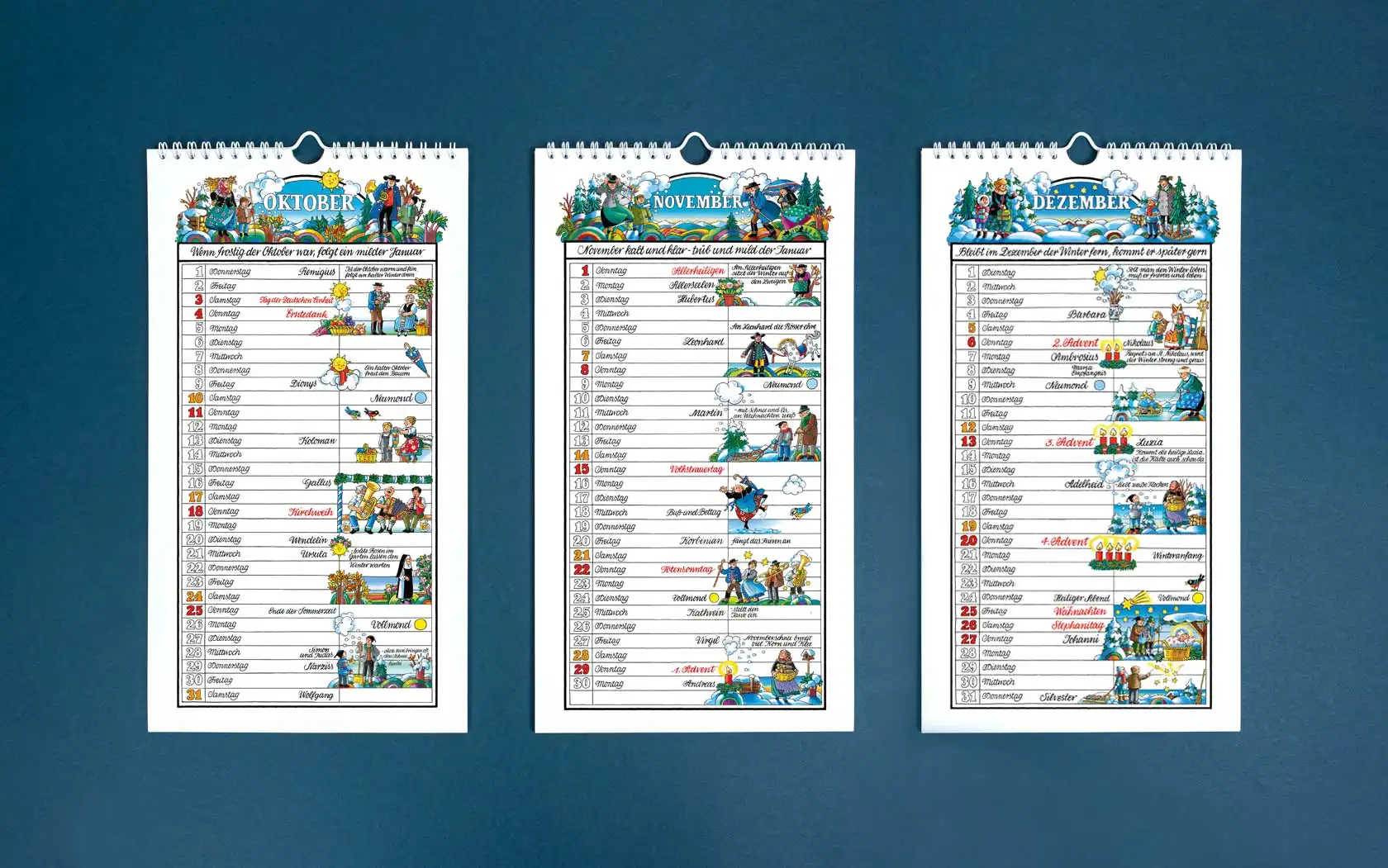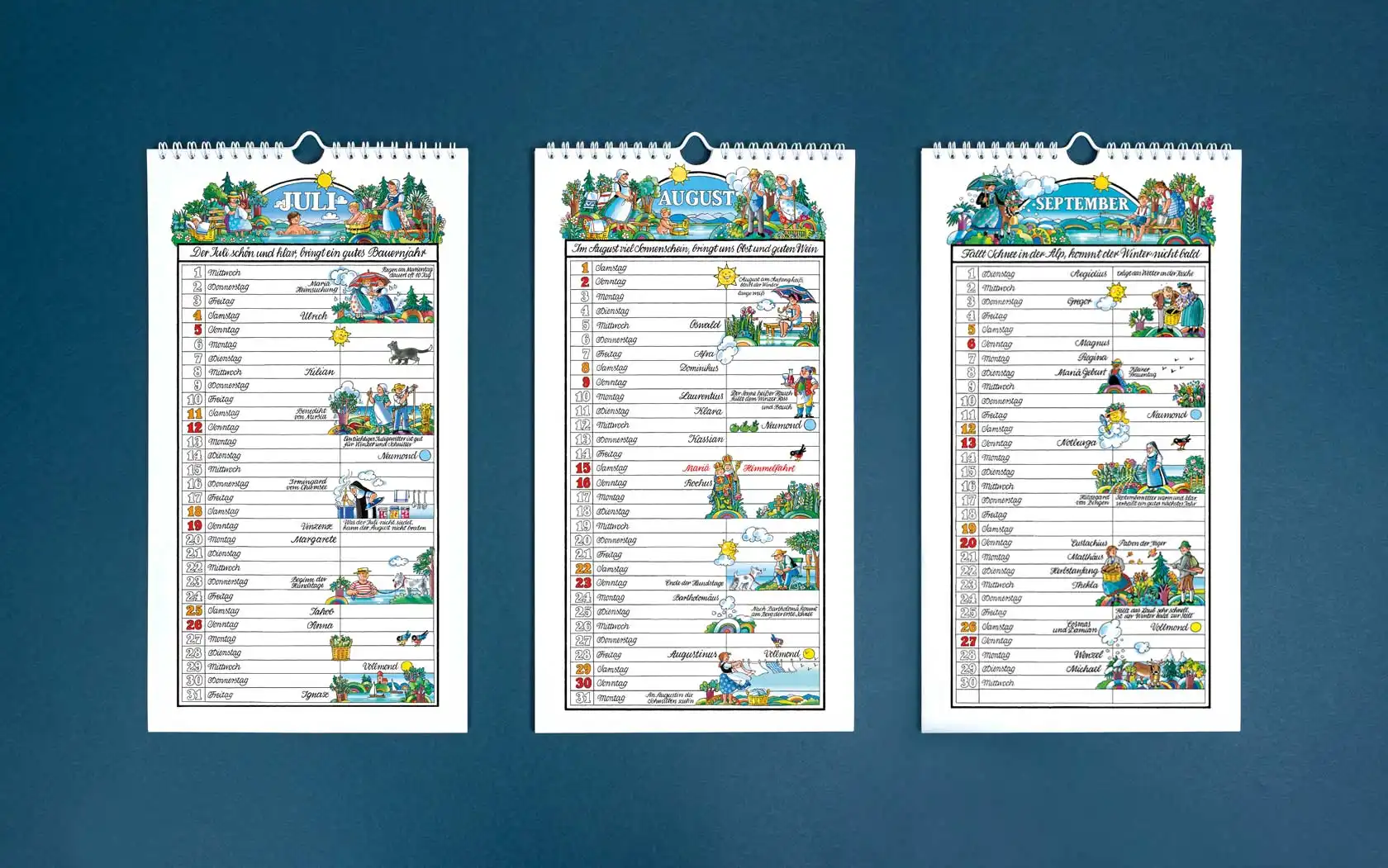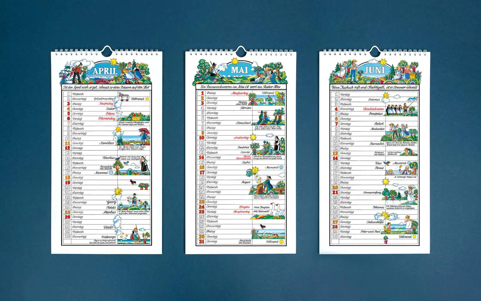 Von Ingrid Schlemmermeyer mit viel Liebe zum Detail gestaltet und illustriert, ist der Kalender ein treuer Begleiter für alle, die mit den alten Traditionen durch das Jahr gehen möchten. Von den Mondphasen über Namenstage und Feiertage, bis hin zu humorvollen Sprichwörtern und alten Bauernweisheiten, ist alles Wichtige enthalten. Für private Termine steht in der tabellarischen Gestaltung der einzelnen Monatsblätter genügend Platz zur Verfügung.